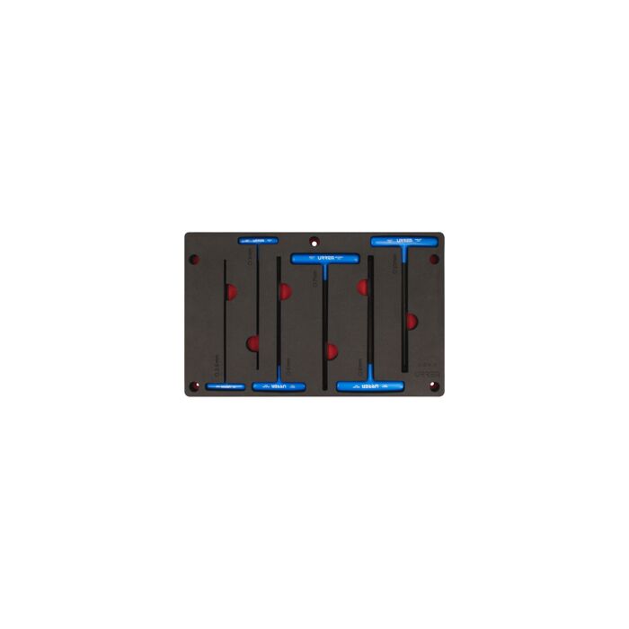 -Juego de llaves hexagonales "T", métricas, con bandeja de espuma EVA diseñada para fijarla en la pared, manteniendo la herramienta en su lugar aunque este en posición vertical.