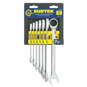 4. Juego de llaves combinadas pulido espejo de matraca mét, 12 puntas, 7 piezas en rack Surtek