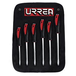 1. Juego de destornilladores con mango bimaterial de golpe, punta plana, 6 piezas en estuche Urrea