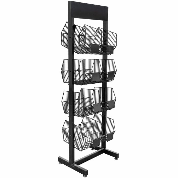 -Estructura de perfil tubular cuadrado metálico con pintura electrostática resistente a la corrosión. Cuatro canastillas de malla metálica con ajuste de inclinación para mejorar la visibilidad de los productos. Divisores móviles y removibles para adaptar el espacio según el tamaño y tipo de producto. Capacidad de carga de 20 kg por nivel, ideal para productos ferreteros de distinto peso y volumen. Porta precios en cada nivel para facilitar la identificación del producto.