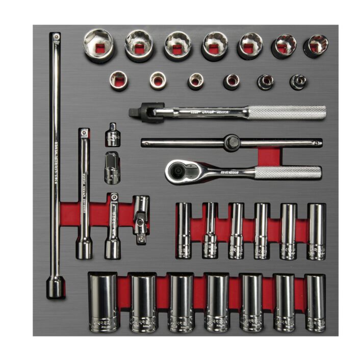 -Juego de dados con sistema de organización de herramientas basado en bandejas fabricadas en espuma de EVA que cuentan con cavidades específicas para cada tipo de herramienta.