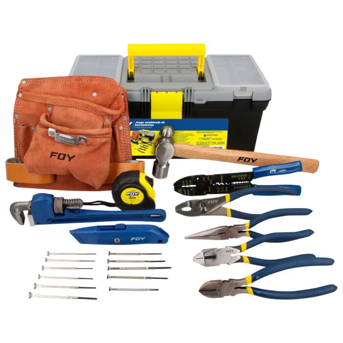 -3 pinzas para electricista diferentes usos. 11 destornilladores de precisión. 1 navaja de retráctil. La herramienta viene dentro de una caja plástica de 16x7” con charola organizadora.